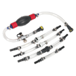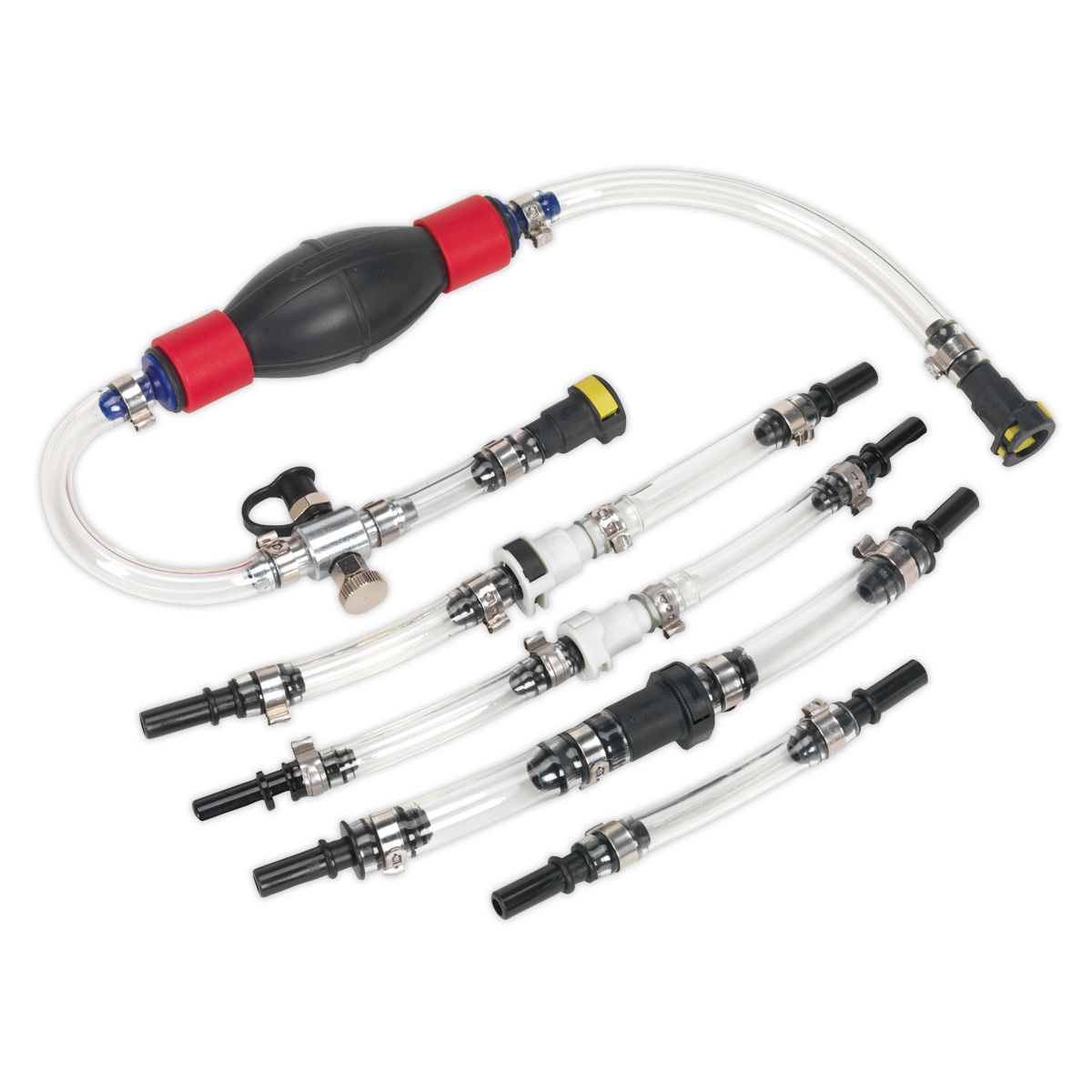 Designed to work in conjunction with the low pressure fuel circuit, to reintroduce fuel back up to the fuel line after maintenance. Clear pipes allow visual detection of any air within the fuel system or being inadvertently drawn into the fuel line. Model has a valve to work in conjunction with Ford IDS diagnostic equipment, allowing the vacuum to be monitored.