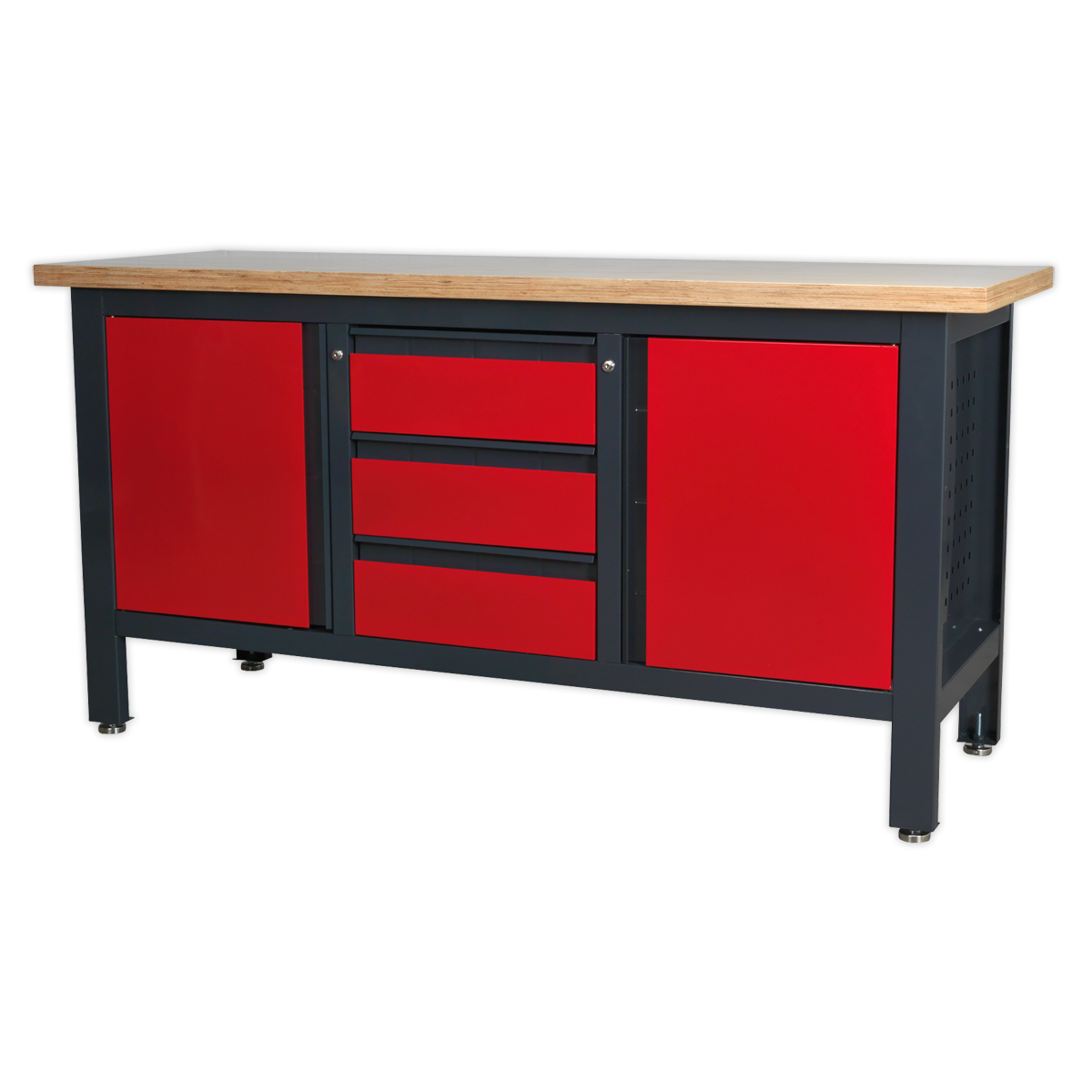 Heavy-duty powder coated metal frame with a 40mm MDF work surface. Storage splits into 3-sections with a choice of cupboards, drawers and an open space with an adjustable shelf. All cabinet drawers fitted with ball-bearing slides. Fully lockable and features adjustable feet to help stability when placed on an uneven surface. Supplied flat-packed with two keys.