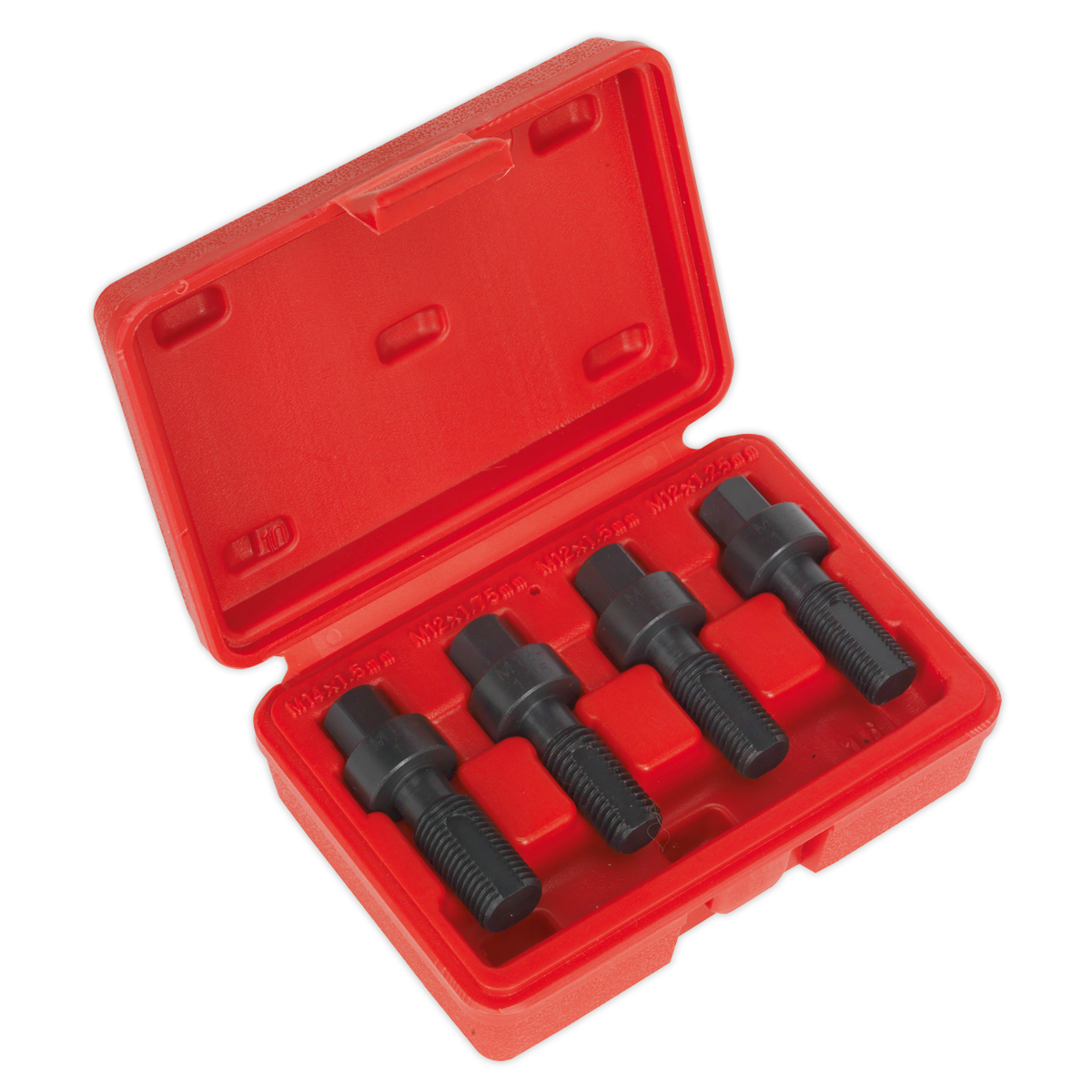 Contains the four most common wheel bolt thread sizes. Suitable for cleaning and repairing damaged wheel hub threads, saving time and money. Use with 12mm socket or spanner. Supplied in storage case.