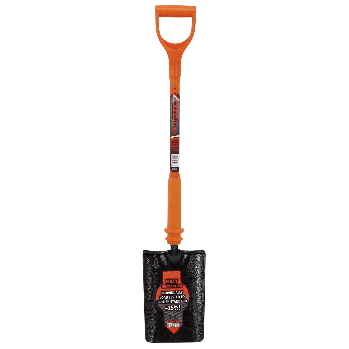 Expert Quality, fully insulated trenching mouth shovel designed for working near live cable and wires. Individually tested to 10,000 volts, guaranteeing safe working on 1,000V and complying to the BS 8020 standards. Manufactured with an epoxy fibreglass core and attached to a fully enclosed insulated shaft with hand slip guard. Each shovel is supplied with a certificate of conformity, which correlates with a unique traceability number embossed on the shaft. Sold loose.