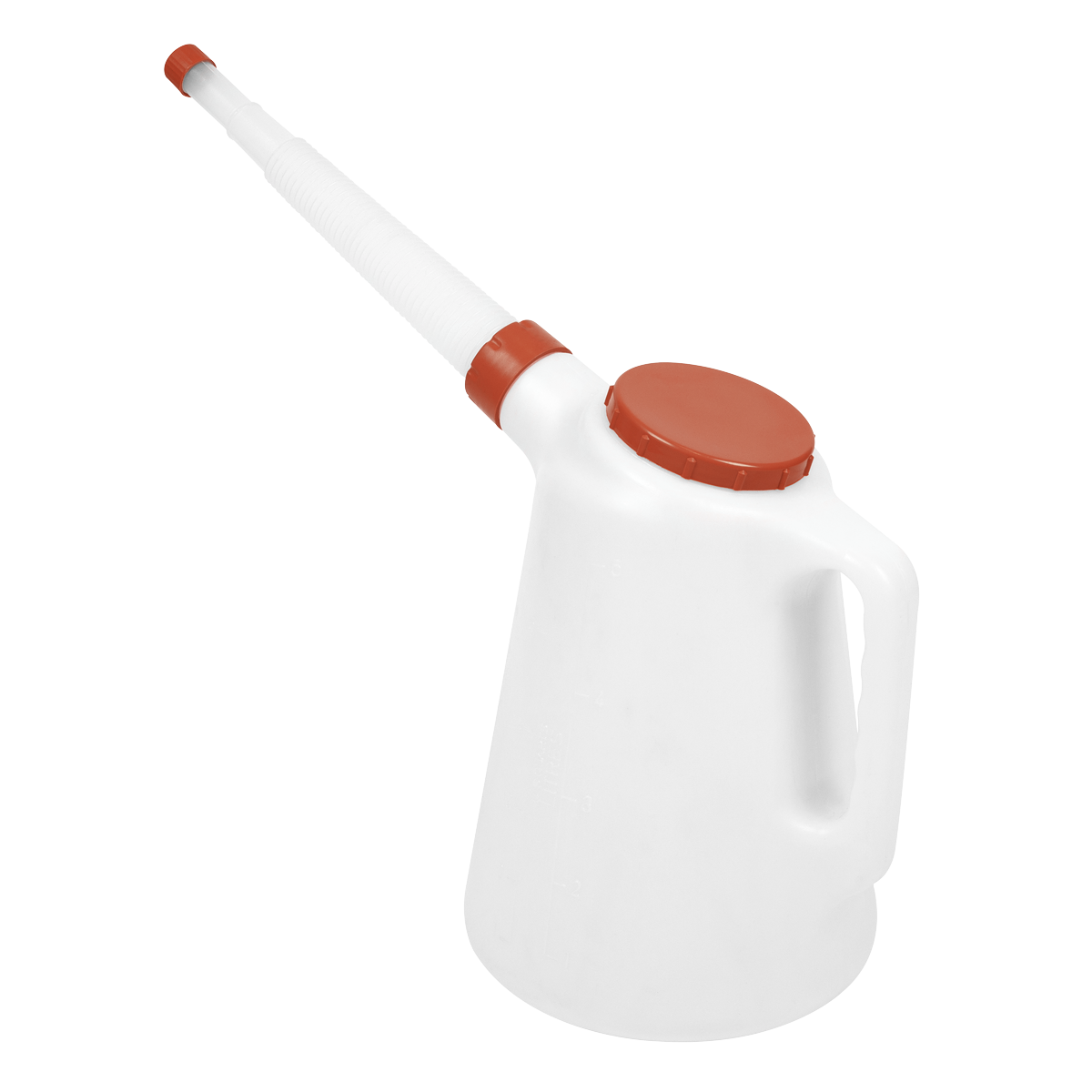 Polyethylene jug resistant to oil and similar viscosity fluids. Removable flexible spout. Red screw cap and lid enables jug to be used as a container, to ensure safer handling of liquid, preventing spillages. Scales on these jugs are for indication purposes only and are not intended for 100% accuracy.