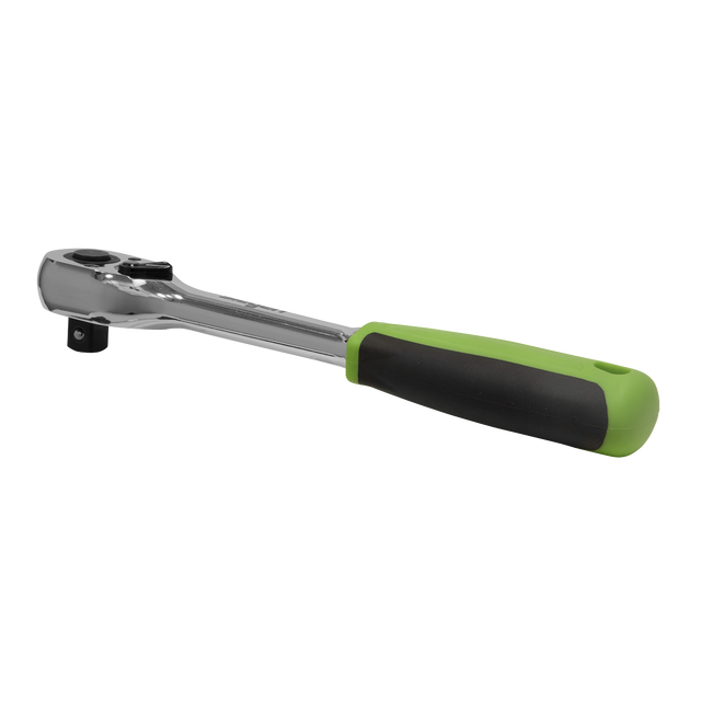 Chrome Vanadium steel 72-tooth ratchet wrench, hardened and tempered, with a fully polished mirror finish. Features pear-head with flip reverse, push-button quick release and anti-slip comfort grip.