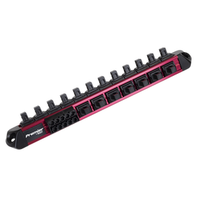 Durable anodised aluminium socket rail with lockable nylon clips. Triangular design allows storage for up to 18 sockets and 10 bits. Lock and unlock sockets with a simple side to side movement. Fixing holes enable cabinet or wall mounting. Suitable for retaining 3/8"Sq drive sockets and 1/4"Hex bits.