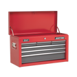 Perfect intermediate size locking chest. Features drop-down carry handles, smooth 25mm ball-bearing drawer slides and cylinder lock with locking bars for additional security.