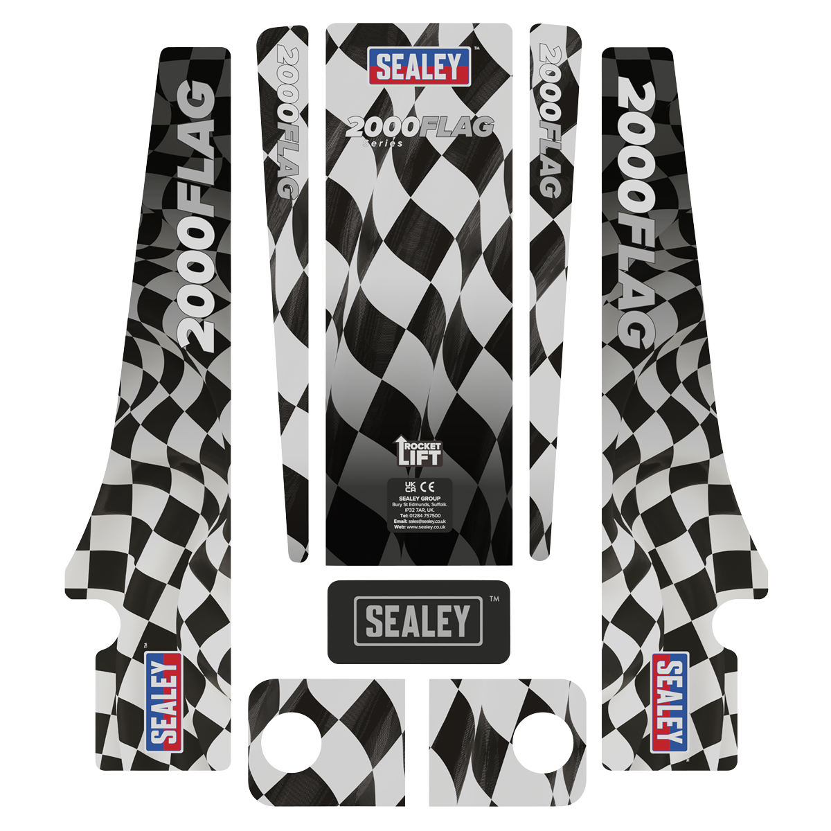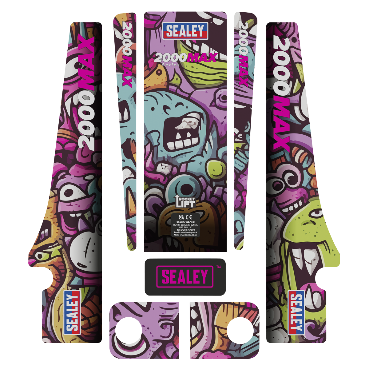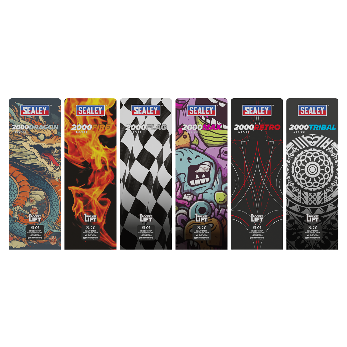 Supplied with 6 full sets of interchangeable graphics for individual customisation of the jack. Twin piston Rocket Lift feature brings saddle to maximum height in minimal strokes. Universal joint release mechanism allows safer, more controlled lowering of jack. Profiled lifting arm gives low clearance height of just 85mm making it suitable for sports and custom cars. Heavy-duty steel chassis provides stability and endurance. Fitted with an overload valve for added safety. Hydraulic oil bypass system protects ram from being overextended. Fitted with safety overload valve and pump-through valve to prevent handle locking at maximum ram extension.