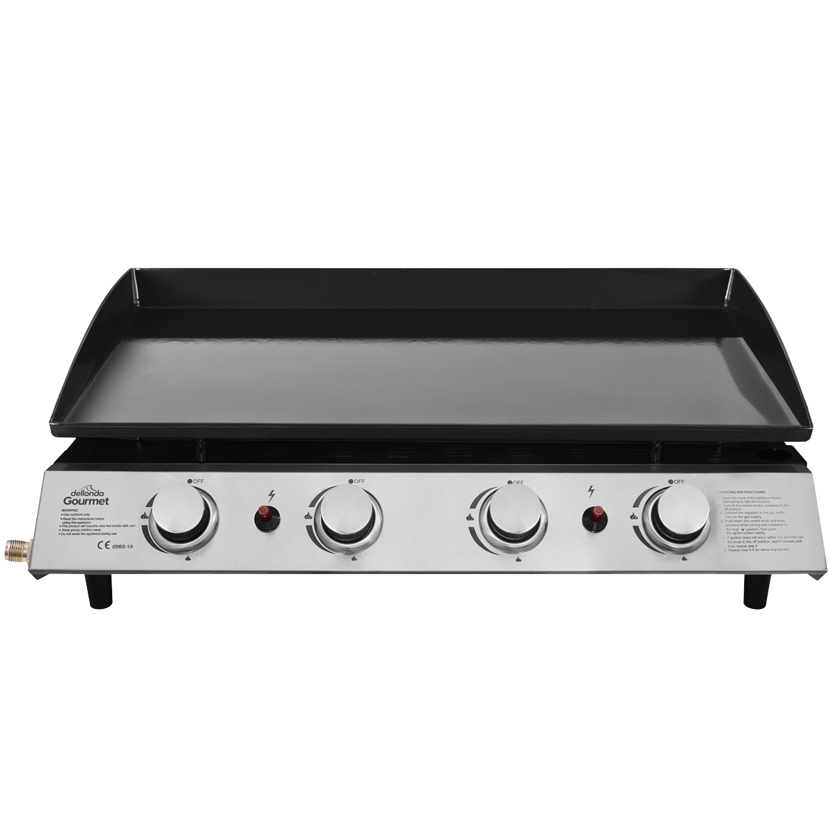 Gas plancha with four stainless steel burners. Piezo ignition ensures a safe and easy start-up every time. 3.5mm High quality steel cooking plate with an enamel coating. Supplied with regulator and hose assembly for use with propane patio gas bottles.
