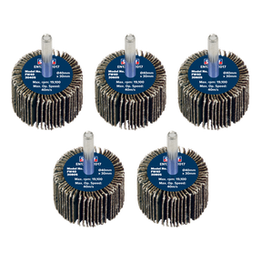 Aluminium oxide abrasive flap wheels on Ø6mm shaft. Suitable for use with power drills. Supplied in pack of five. Ø40 x 30mm. Pack includes 40Grit (x1), 60Grit (x2) and 80Grit (x2).