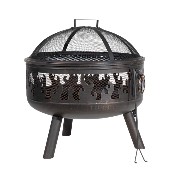 Features galvanized grill giving the option of an alfresco dining experience. Includes mesh safety screen to prevent embers and sparks flying. Suitable for use with untreated wood and logs. Bowl Depth: 24". Supplied with fire poker. Assembled Dimensions (Ø x H): Ø61 x 65cm.