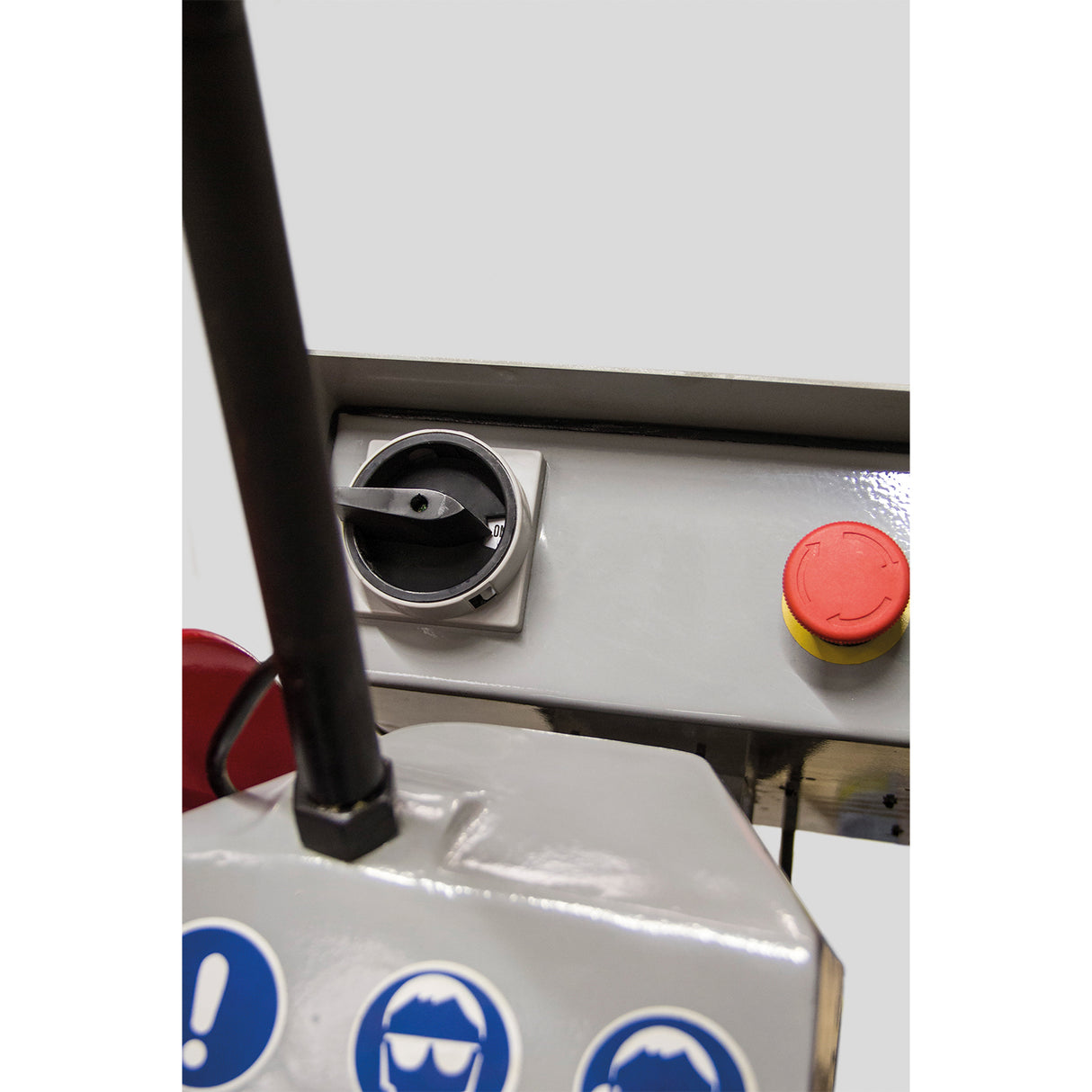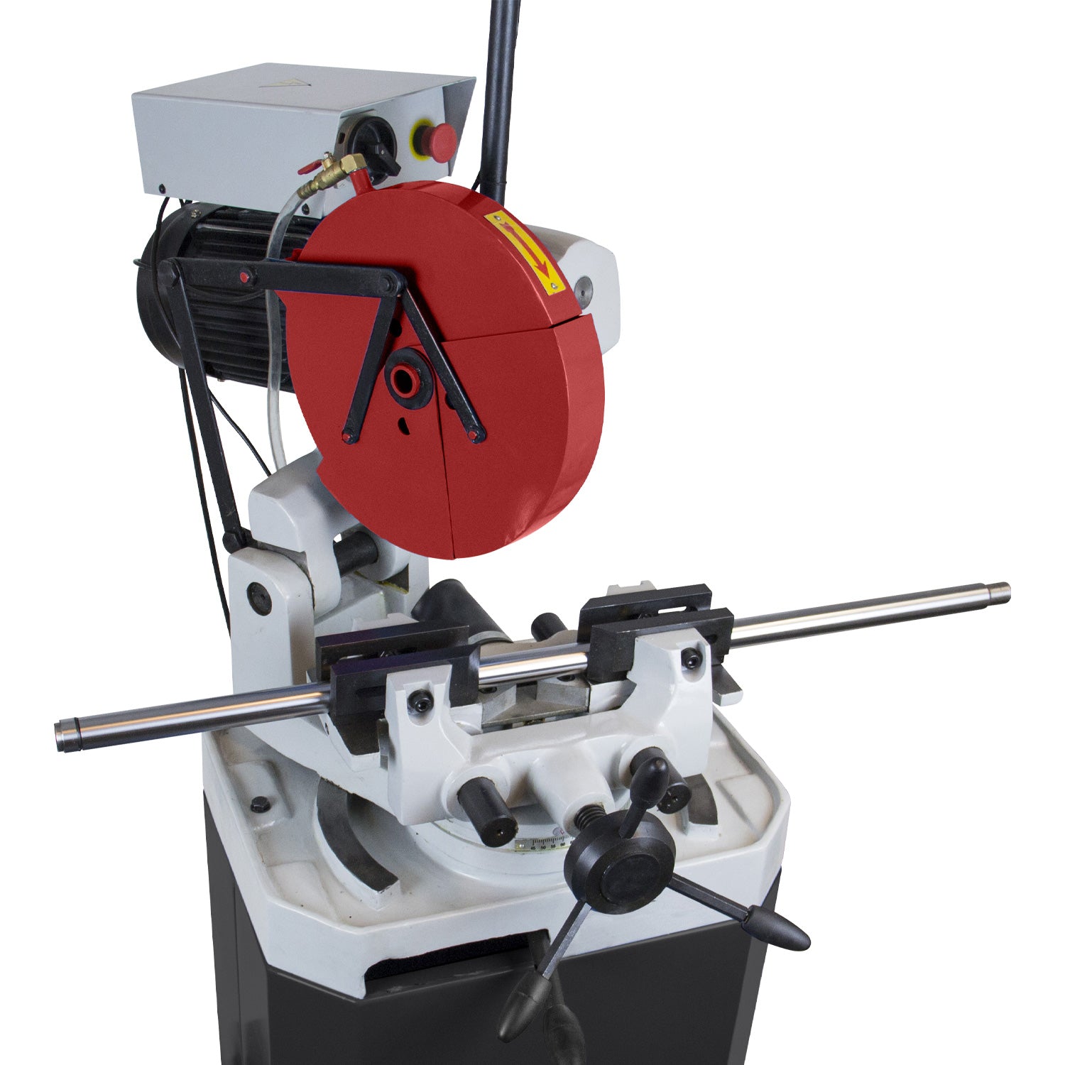 A swivel head design allows for precise angled cuts, while the cranked pull-down handle with integrated ON/OFF switch and emergency stop provides user-friendly control. The twin jaw vice ensures secure and accurate workpiece positioning, ideal for repeatable, high-precision cuts.