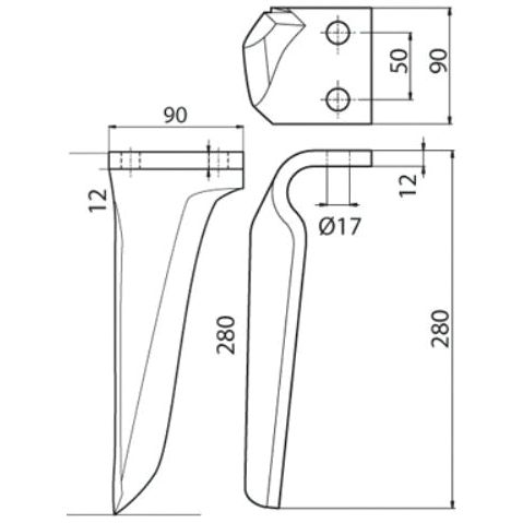 Power Harrow Blade 90x12x280mm RH. Hole centres: 50mm. Hole Ø 17mm. Replacement for Kverneland, Maschio. To fit as: 27100209 | Sparex Part No.S.77284 1.72 kg