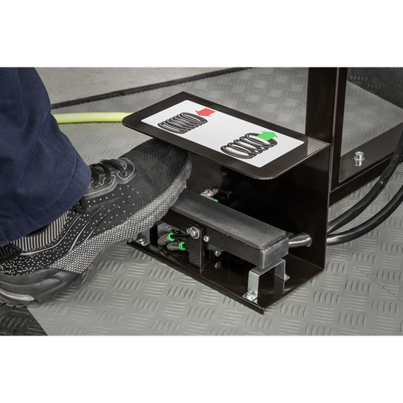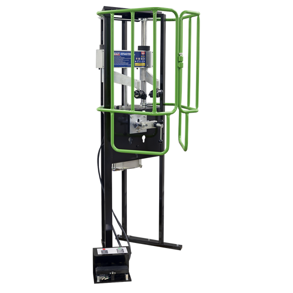 Fast and safe compression of suspension coil springs. 3000kg Air operated unit with safety locking guard. Adjustable swivel upper arm clamps. Also includes a suspension strut clamp. Fits a wide range of left and right-handed coil spring configurations and diameters.