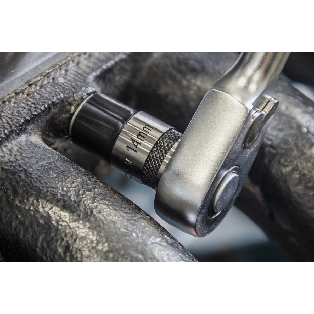 - Comes with a knurled ring for improved grip, even when handling oily or slippery fasteners, and is conveniently supplied on a socket rail for easy organization.
