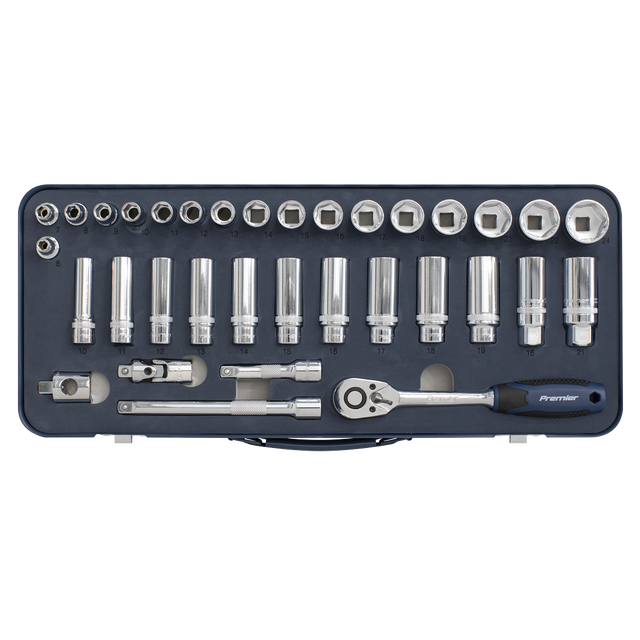 Heat treated, drop-forged Chrome Vanadium 6142 steel sockets and accessories with a fully polished mirror finish. Features specially machined flutes in the walls of the socket which enable use on up to 85% rounded fasteners. This not only provides added strength but also prevents damage to worn or rusted fixings. Standard sockets cover sizes from 6 to 24mm and deep sockets from 10 to 19mm. Features 48-tooth gear-to-gear flip reverse comfort grip ratchet wrench with push-button quick release, extension bars, spark plug sockets, universal joint and 1/2"Sq Drive - 3/8"Sq Drive Male Adaptor. Includes contents map displayed inside the lid. Supplied in metal storage case.