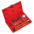 Timing tool kit that covers a wide range of VAG petrol engines. Includes the necessary tools for setting the engine at TDC, the locking tools for both types of timing chain tensioner and a tool for the oil pump chain tensioner. Also includes the tool essential for removing the camshaft control valve.