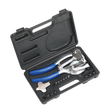 Heavy-duty drop-forged and heat treated steel punch body with compound lever action. Suitable for precision punching of holes in steel, aluminium, brass, copper and plastic. Fitted with gauge for depth adjustment up to 50mm. Suitable for materials up to 14 gauge. Punches and dies hardened to 55-60 HRC. Supplied in storage case.