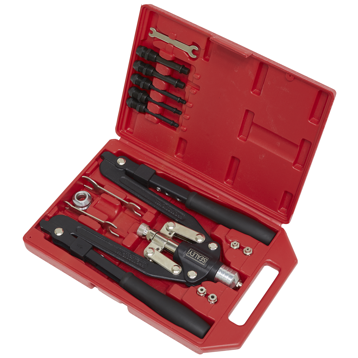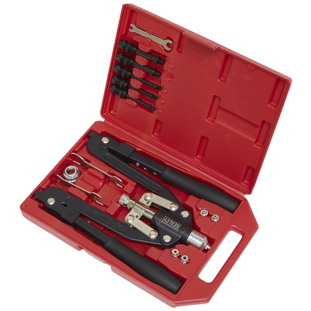 • Comfortable cushion grips. Suitable for installing threaded centre rivets for securing threads in thin sheet material.