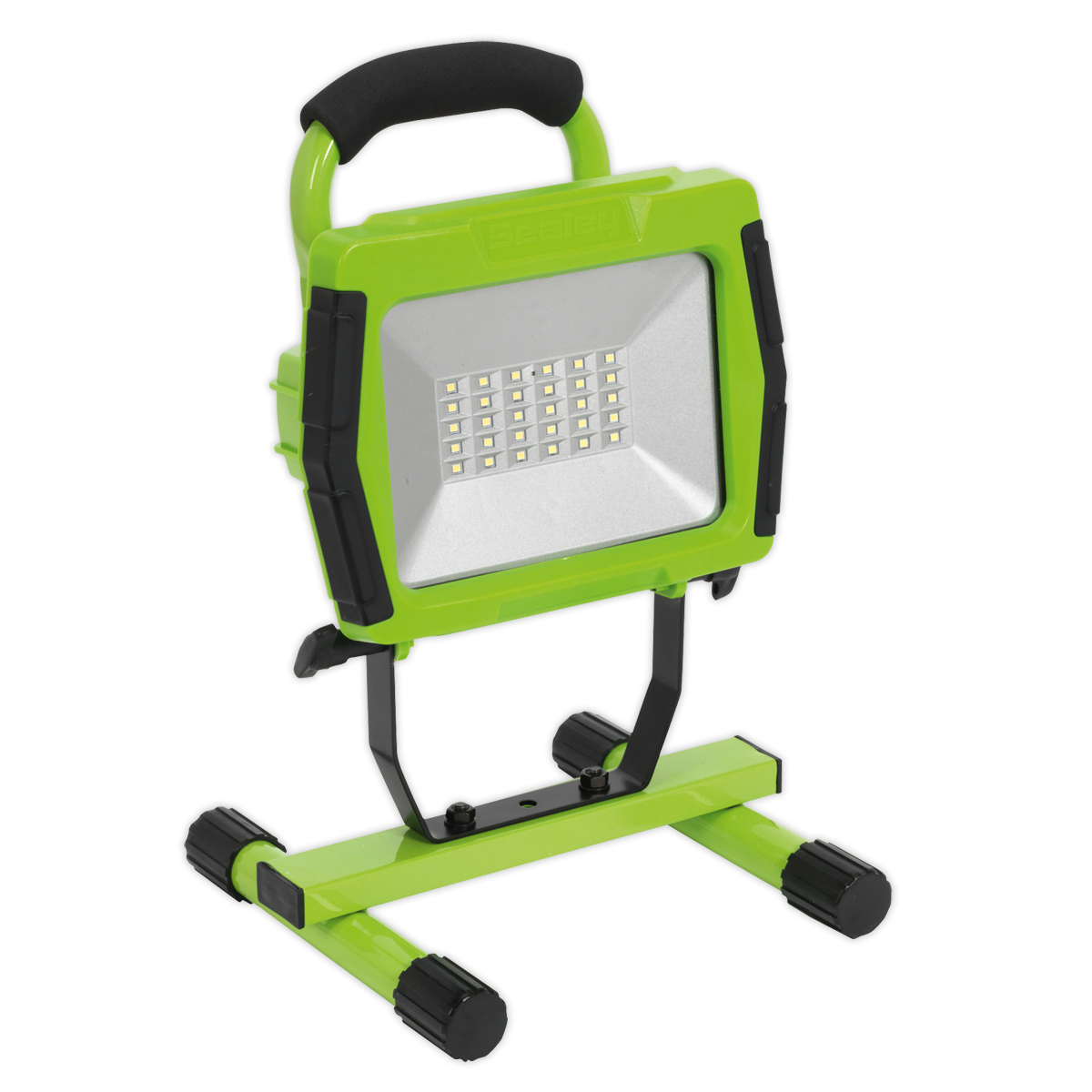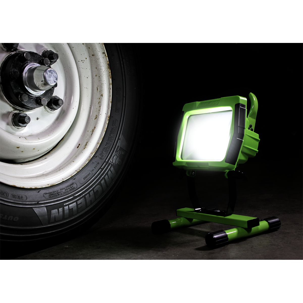 Portable floodlight with adjustable head, housed within a stable steel frame. Features 10W SMD LED produces a super bright beam, giving a full 120° spread of light. Weatherproof design with an on/off rocker switch and two light settings. Supplied with mains charger and 12V in-car charger. Suitable for lighting workshops, garages and other environments where no mains supply is available.
