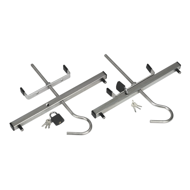 Universal fitment for roof racks providing a safe and easy way to secure ladders. Corrosion resistant finish. Suitable for trades where ladders need to be transported safely for on site applications. Supplied with two heavy-duty iron padlocks for security. Made in the UK.