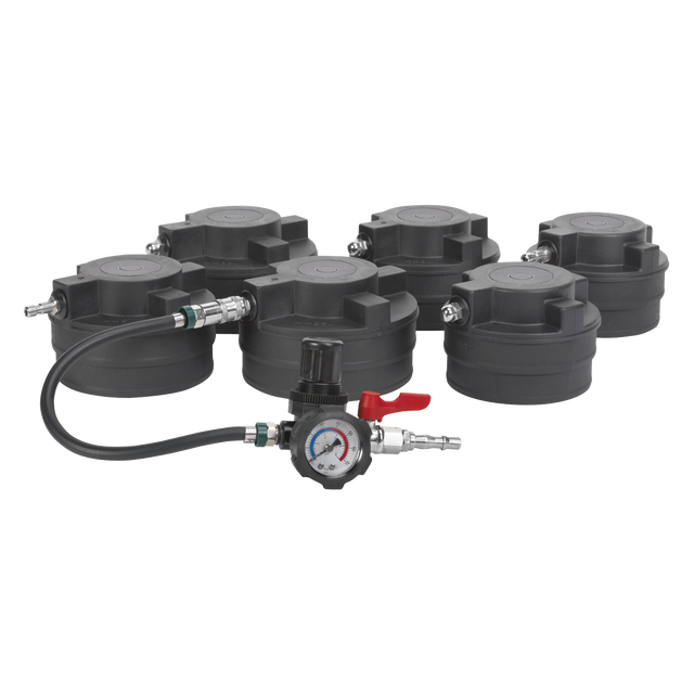 Designed to charge the turbo/intercooler system with a low pressure of regulated workshop air to show the presence of leaks within the system. Kit supplied with three pairs of stepped adaptors to fit most sizes of hose found on heavy commercial vehicles. Features a pressure gauge, shut-off valve and pressure release valve. Supplied in storage case.