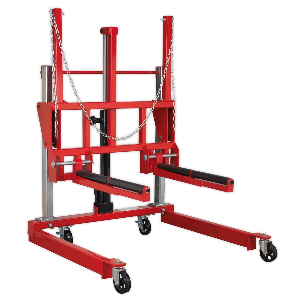 Suitable for changing wheels and tyres on large vehicles. 8-Position adjustable roller width ranging from 440-780mm, giving greater flexibility. Load arms incorporate smooth roller action sleeves allowing wheel to be rotated for lining up on studs. Foot operated hydraulic mechanism with dead man's control release. Mounted on two rear locking castors and two front castors for stability and easy manoeuvrability. Supplied with safety chain.