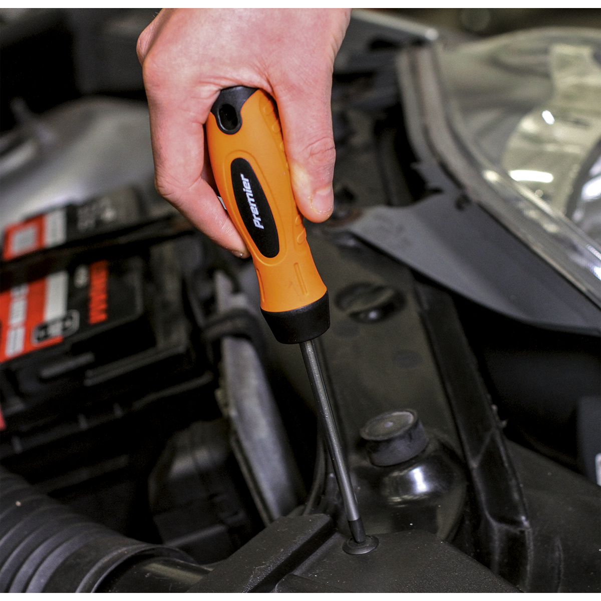 High quality Chrome Vanadium steel satin finished shafts with shot blasted and magnetized tips. Ergonomically shaped handles maximize power transfer from hand to fixing. Feature hi-visibility handles with hanging holes for easy storage.