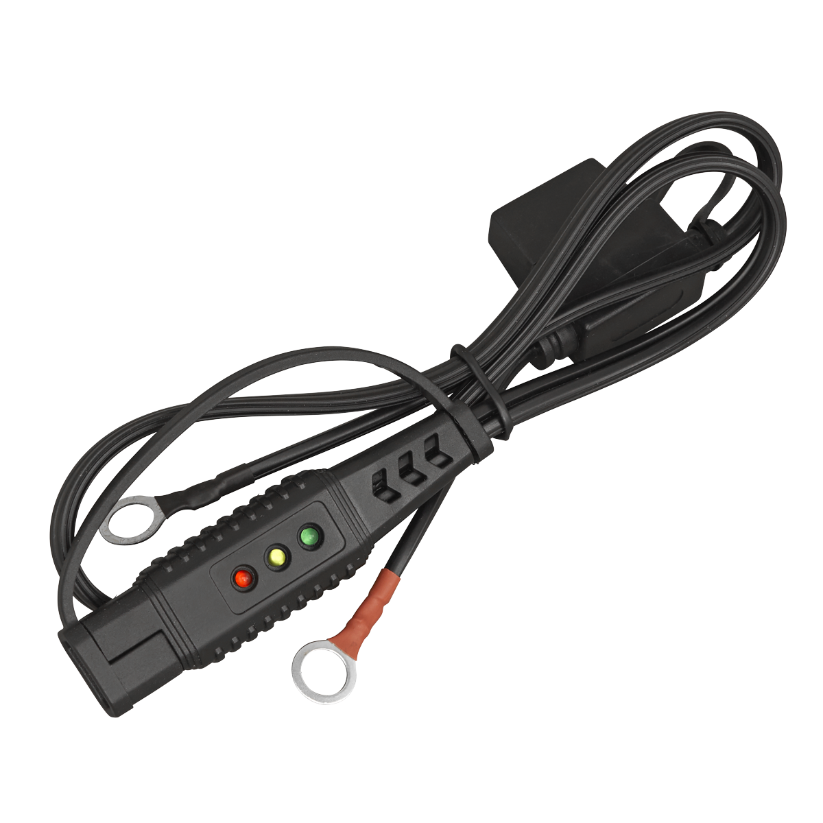 12V Ring terminal battery indicator cable. Three LED coloured indicators showing battery status. SAE “quick” connector plug with protective cap end. 15A Replaceable in-line fuse. Cable length: 700mm. For use with our AUTOCHARGE, MBC and SPI range of 12V chargers.