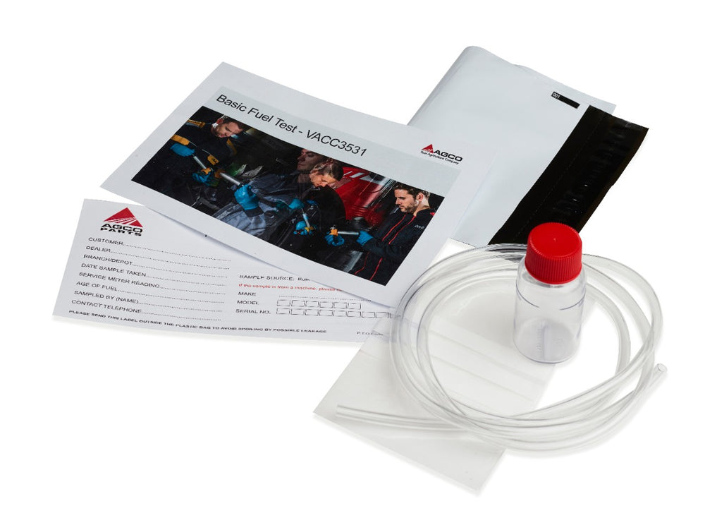 The test covers key parameters such as color, appearance, particulates, ISO particle count, water content, sulfur levels, and much more. Additionally, it provides insights into wear and additive metals, bio content (FAME), and checks for bacterial and fungal contamination. This wide range of diagnostics makes it an invaluable tool for those looking to maintain fuel quality and prevent engine-related issues. The kit includes a sample bottle, extraction hose, and a return envelope for convenient submission of the sample through your AGCO dealer.