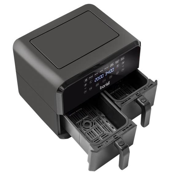 • Dual basket function allows you to cook different foods on different cooking programmes, so each part of your meal is ready simultaneously.