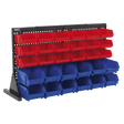 Workbench or countertop parts storage system. Suitable for storing nuts, bolts, screws or any small components. Helps to keep work area tidy and parts to hand. Thirty storage bins mounted onto a composite back panel with steel cross bar and side supports for added stability.