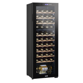 Sleek design with tempered mirror glass door to reflect UV light and help protect your wine. Dual zone design means you can control the temperature of each zone individually, with the upper zone and the lower zone ranging from 5-18°C. Soft white LED light. Annual energy consumption 146 KWh/a. Features stylish wooden shelves made of beech with space for up to 16 bottles of wine in the upper zone and 28 bottles of wine in the lower zone. Compressor cooling technology with automatic defrost feature to make this unit as easy as possible to use. Energy Efficiency Class G. Noise Level: 43dB. Accommodates Max. Bottle Height: 330mm. Size (W x D x H): 430 x 480 x 1260mm. A minimum space of 50mm is required for the rear of the fridge and 30mm for the top and both sides. This will maximise the efficiency, performance and life of the fridge and also ensure that there is sufficient space for the hinge to operate effectively. Please note this product will not reach a higher temperature than the ambient temperature of the room.