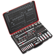Professional socket set with heat treated Chrome Vanadium steel sockets and accessories. Fully polished micro satin finish. Standard sockets cover sizes from 4 to 32mm and deep sockets cover sizes from 6 to 32mm. Features 90-tooth gear-to-gear ratchet wrench with quick release, extension bars, universal joint, adaptors, sliding T-bar and spinner handle. Includes contents map displayed inside the lid. Supplied in metal storage case with removable EVA foam tray.