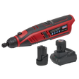 Compact, lightweight cordless multipurpose rotary tool and engraver. Comfortable composite housing with soft grip to reduce vibration. 6-Speed settings provide the control required to complete various tasks. Quick release collet and spindle lock for fast tool changes. Supplied with a full range of tips, wheels, sanding discs, dressing stones and a chuck spanner. Integral LED battery level indicator. Supplied with 1 hour mains charger, 2 x lithium-ion 1.5Ah batteries and canvas storage bag.
