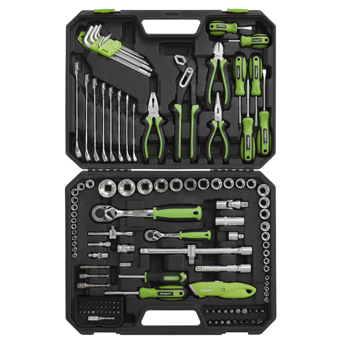 Comprehensive range of frequently used hand tools with 1/4" and 1/2"Sq Drive Reversible ratchet wrenches. Includes 1/4", 3/8" and 1/2"Sq drive sockets, hex keys, combination spanners, screwdrivers, pliers, utility knife, bit set and accessories. Tools feature soft grip handles for comfort and control. Supplied in a storage case.