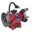 Induction motor drive suitable for general use. Fitted with stone guards, adjustable eye shields and spark arrestors. Includes water tray for cooling hot materials. Features built-in wheel dresser for cleaning, sharpening and truing grinding wheel surfaces. Pivoting worklight for added visibility in poorly illuminated areas. Supplied with coarse and fine aluminous oxide stones for general workshop grinding and sharpening.