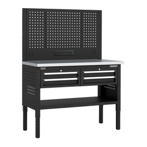 • Perforated back panel designed as a pegboard for quick and easy-access to workshop tools.