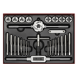 • Set includes dies and taps (taper and plug) in each size, tap wrench, T-bar tap wrench, die holder, thread gauge.