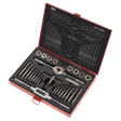 High quality alloy steel taps and dies. Split dies with machined lead-ins for ease of use. Die holder features self-centring mechanism for straight and accurate thread cutting. Set includes taper and plug taps, T-handled tap wrench and Metric screw pitch gauge. Supplied in storage case.