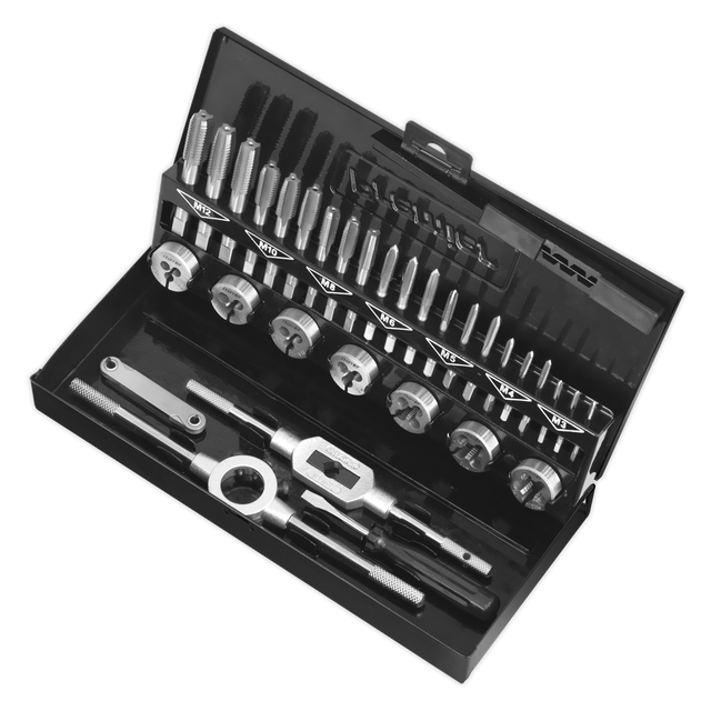 M3 to M12 steel tap and die set manufactured from HSS 4341 steel providing improved cutting performance and longevity. Split dies with machined lead-ins for ease of use. Taps supplied in three types for each size, taper (starting), second tap (intermediate) and plug (bottoming); matched by equivalent sized dies. Provides all functions required for a professional engineer. Set includes tap wrench, steel die handle, screw pitch gauge and screwdriver. Supplied in metal case.