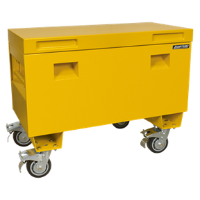 Manufactured from heavy gauge steel with seam welded joints. Folded lips add strength and rigidity. Box may be secured with a padlock hidden in recess at the front. Tamperproof locking system protects padlock for extra security. Features industrial strength handles on each side of box for manoeuvrability. Lid features gas support strut for easy-opening. Fitted with welded feet allowing unit to be moved by forklift. Supplied with castors. Suitable for secure storage of tools and heavy equipment on site, vehicle, in the workshop or at home.