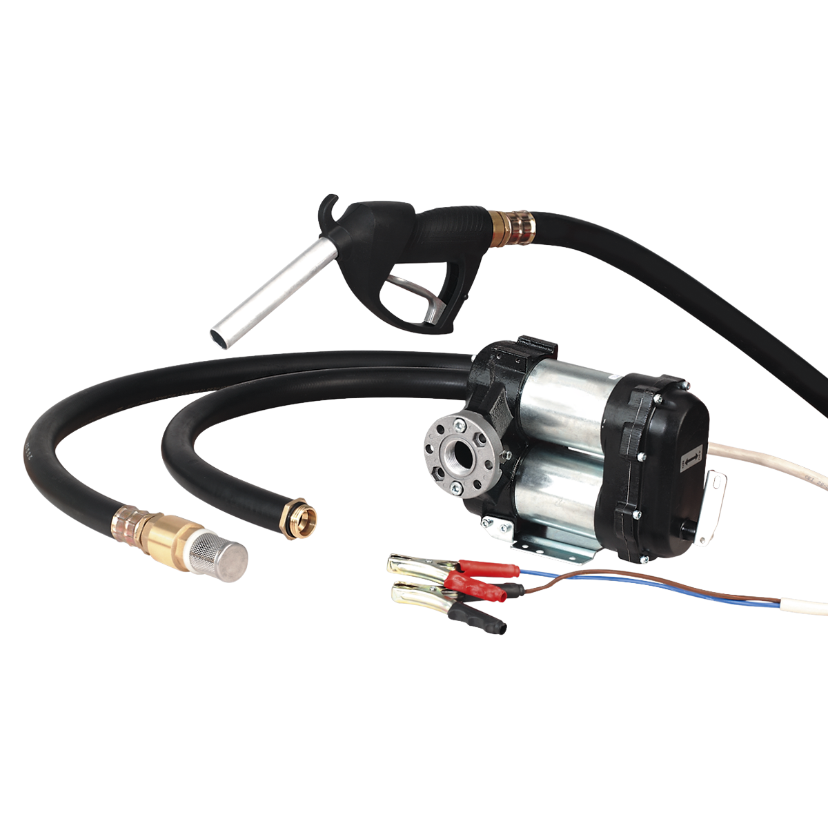 Electric 24V pump kit with battery clips. High flow pump unit with bypass valve, suitable for filling diesel vehicles in the field. Cast iron pump body with anti-corrosion finish. Includes on/off switch, delivery hose with manual delivery nozzle and filter.