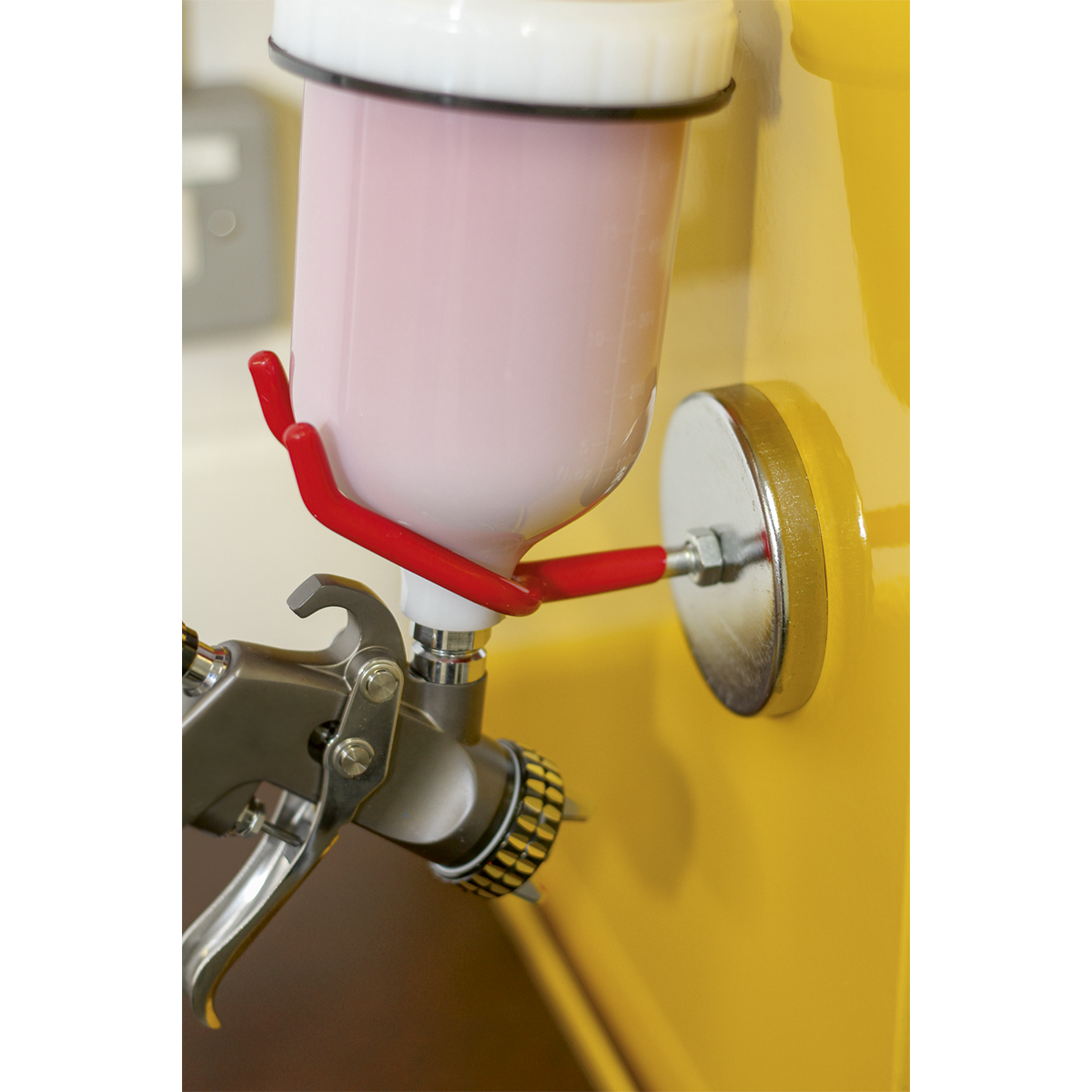 Heavy-duty magnet will adhere to any ferrous surface. 50mm Wide steel hook with protective rubber coating. Suitable for use with most gravity fed spray guns.