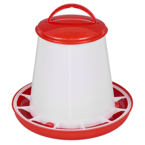 Twist lock base fitting secures the base of the feeder. Features removable lid to protect the contents and built-in hanging handle. Anti-scrape ring prevents feed being spilled and built-in fins evenly distribute the feed. Manufactured from high quality plastic with a robust design. Suitable for use with all types of poultry.