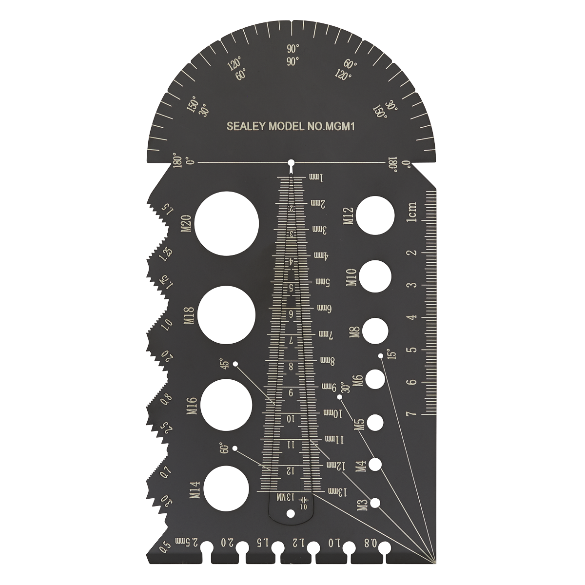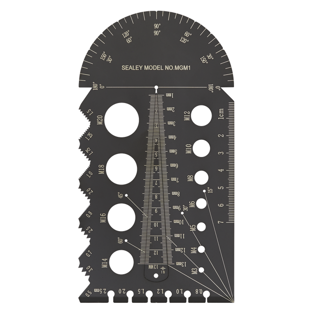 Stainless steel multifunction thread/pitch identification gauge. Easily identify the size of bolt, drill bit or tap that is required. Checks the thickness of washers and diameter of electric wire. Use as a set square, to measure angles 0-180° and as a ruler.