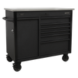 All heavy-duty steel construction and manufactured with steel inner walls for extra strength and durability. Heavy-duty 45mm ball-bearing drawer slides provide superior performance, suitable for heavier loads. Full height rear locking mechanism, locks smooth running soft close drawers in place. Rust and solvent resistant black crinkle effect finish. Fitted with four Ø125mm PP wheels with black chrome effect alloys, two fixed and two locking swivel castors. Each drawer features stylish black anodized heavy-duty drawer pulls plus pre-cut non-slip liners. Power tool charging drawer fitted with 230V sockets (x4) and 5V 2.4A USB sockets (x2). Stainless steel 'flip-top' split providing a work surface and additional storage. Two cylinder locks allow drawers and power tool charging drawer to be locked separately.