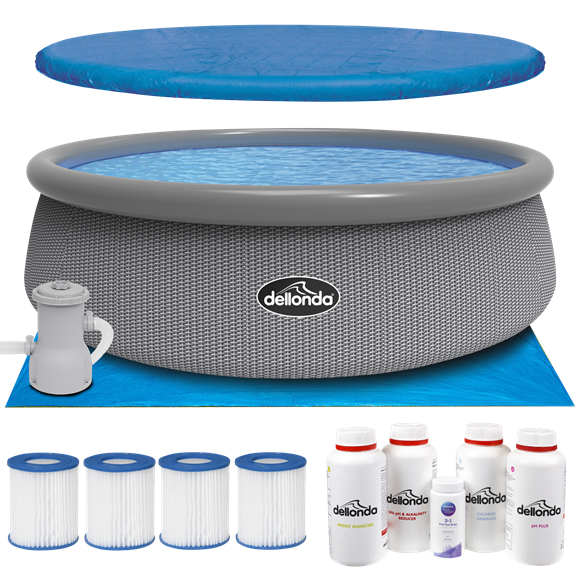 • Supplied with 530gal/hr filter pump, Cover, Ground Sheet, Test Strips, Swimming Pool Starter Kit and Filters.