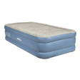 This high raised single air bed with built-in 230V electric pump offers an effortless and quick way to inflate and deflate the mattress. This air bed is designed with elevated heights, making it easier to get in and out of bed. The increased distance from the ground provides a more comfortable sleeping experience, resembling the height of a traditional bed. With a soft flocked surface and made of a strong i-beam construction this air bed is made for comfort and durability. Despite its size when inflated, this air bed is compact and easy to store when deflated. This portability makes it a great option for dry/covered camping such as in camper vans, accommodating guests, or serving as a temporary bedding solution. Constructed from heavy duty vinyl with a flocked surface and i-beam construction this airbed provides great support and longevity.