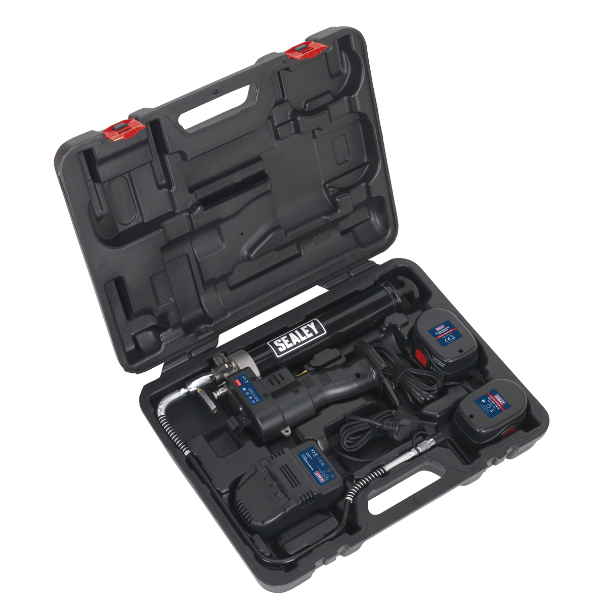 High power, professional, cordless grease gun. Ideal for in-field lubrication where power and speed are required. Suitable for 400g cartridges, manual or bulk filling. Features LCD battery condition indicator, air bleed and heavy-duty aluminium pressure head. Supplied with battery and mains charger in storage case.