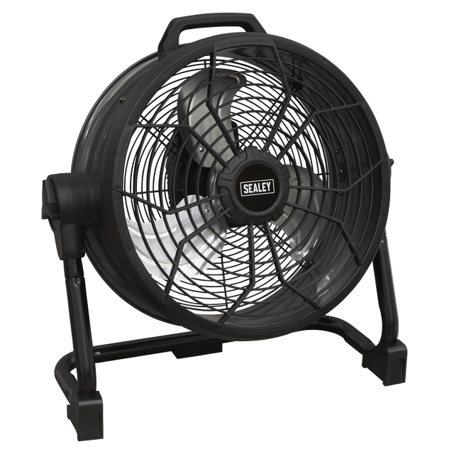 High velocity continuous variable speed drum fan able to move high volumes of air. Mains operated with option of increased versatility by purchasing 20V battery and charger, sold separately. 230V mains lead/transformer included. 360° tilt allows control of airflow to exactly where it is needed; fitted with rubber feet for extra stability. Carefully balanced and fully guarded aluminium blades provide a quiet and safe operation. Lightweight and robust unit with a carry handle for easy transportation. Suitable for use in industrial, commercial, agricultural, automotive workshop, showroom and home applications. Part of the SV20 series - Offering a one battery fits all solution. For 20V operation order a 2Ah, 4AH or 6Ah 20V battery and charger; model numbers are CP20VBP, CP20VBP4, CP20VBP6 and CP20VMC. Up to 5hrs on one 6Ah battery.