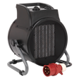 Features PTC heat conducting ceramic elements to achieve an instant, odour-free heat. Ambient room thermostat maintains temperature at a preset level. Ideal for industrial applications with two heat settings or fan only. Supplied with 3-phase power cable and 16A plug.