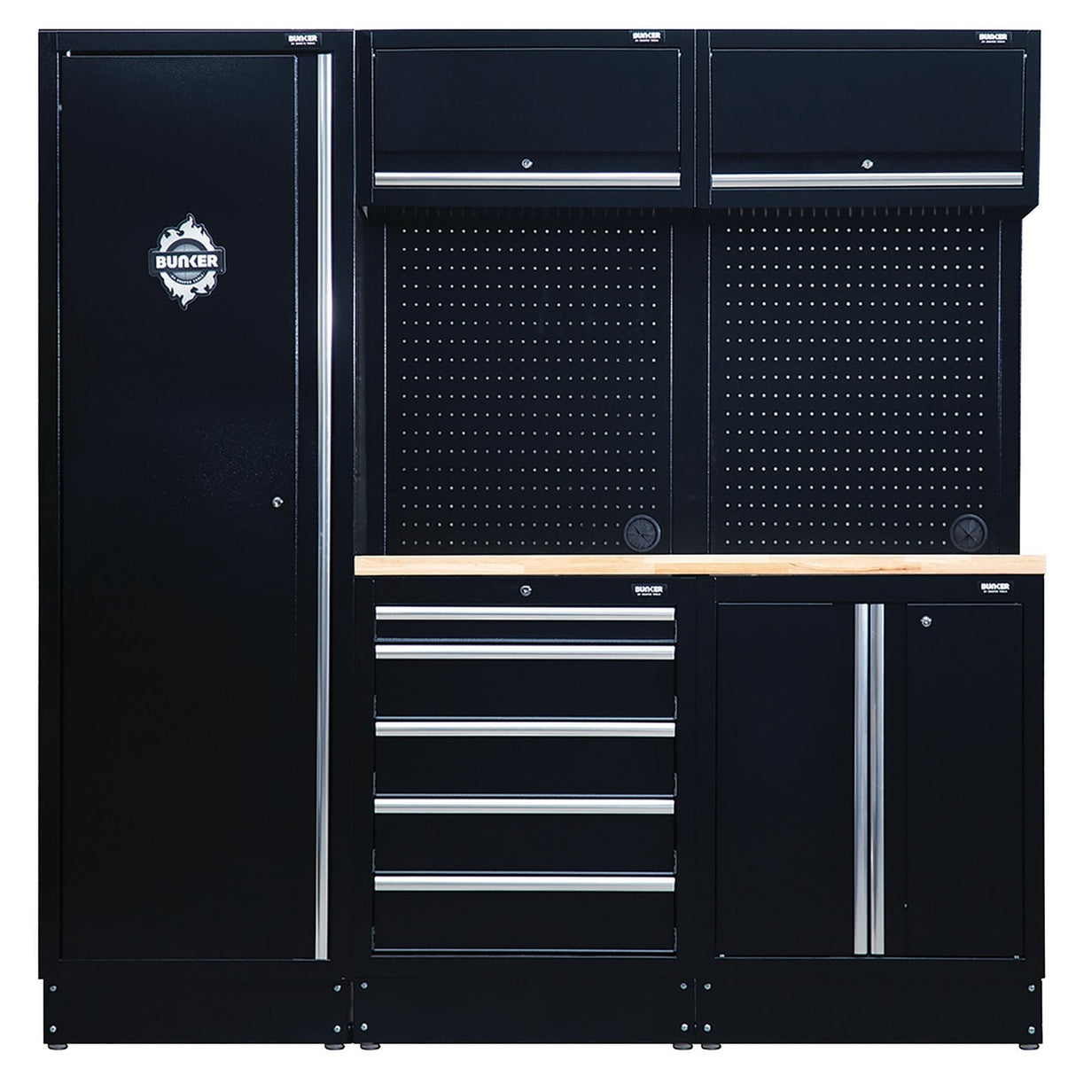 Part of the BUNKER® modular storage system. This stunningly designed combo is easily installed inside a garage or workshop to create your ideal storage system. All units are made from premium-quality steel and have a durable matt black textured industrial powder-coated finish. The floor cabinets are covered by a stylish hardwood worktop and provide incredibly versatile storage, featuring large cupboards with fully adjustable shelves and smooth soft-close drawers lined with lush foam to protect your tools. The fixed base cabinets have adjustable feet for optimal positioning on an uneven floor. All wall cabinets have lift-up doors for convenient access, operated by whisper-quiet gas struts. For added storage, the back panels act as pegboards, and each includes one pre-cut hole for access to a power supply. Each unit has an integral lock for security and two keys are supplied. The combo comes with all the required fittings for simple installation. For your quality assurance, all BUNKER® units include a 10-year warranty. Every combo includes a free magnet of the distinctive BUNKER® logo.